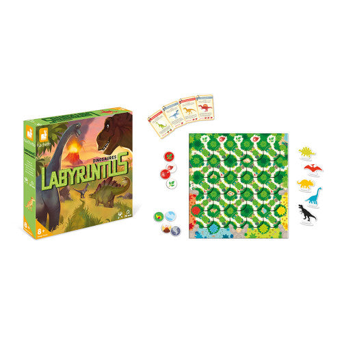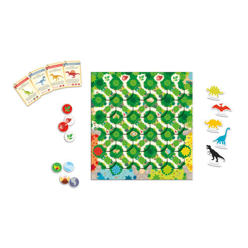 Fraye-toi un chemin jusqu’aux réserves de nourriture et rapporte assez de viande ou de plantes pour rassasier tes dinosaures. Mais attention, ne te trompe pas de nourriture ! Fais-toi aider par le T-Rex pour faire fuir tes adversaires et remporter la partie ! Une partie dure environ 20 minutes. Ce jeu se compose d’un plateau avec 25 roues amovibles, 5 pions dinosaures, 18 jetons nourriture, 10 jetons évènements et 30 cartes dinosaures. Il permet de développer le sens de l'observation, l’anticipation, la logique et d'acquérir des connaissances sur les dinosaures du Jurassique et du Crétacé. Jeu uniquement en français. Idéal pour les enfants à partir de 8 ans. De 2 à 4 joueurs.
