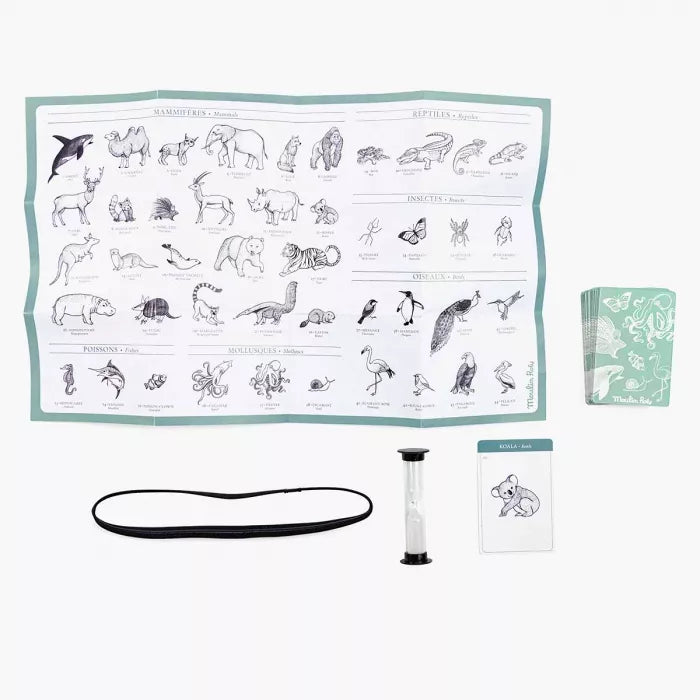 Apprends à reconnaître les animaux en t'amusant ! Tire une carte animal et pose des questions pour deviner qui il est, avant la fin du sablier ! Les images contrastées en noir et blanc aideront l'enfant à se focaliser sur les détails (rayures, taches...).