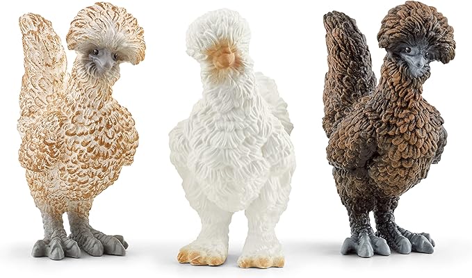 Découvrez la poule soie touffue authentique et détaillée, et les poules hollandaises huppées aux coiffures excentriques dans ce coffret de jouets schleich réalistes. Il est idéal pour les tout-petits qui sont amoureux des animaux.