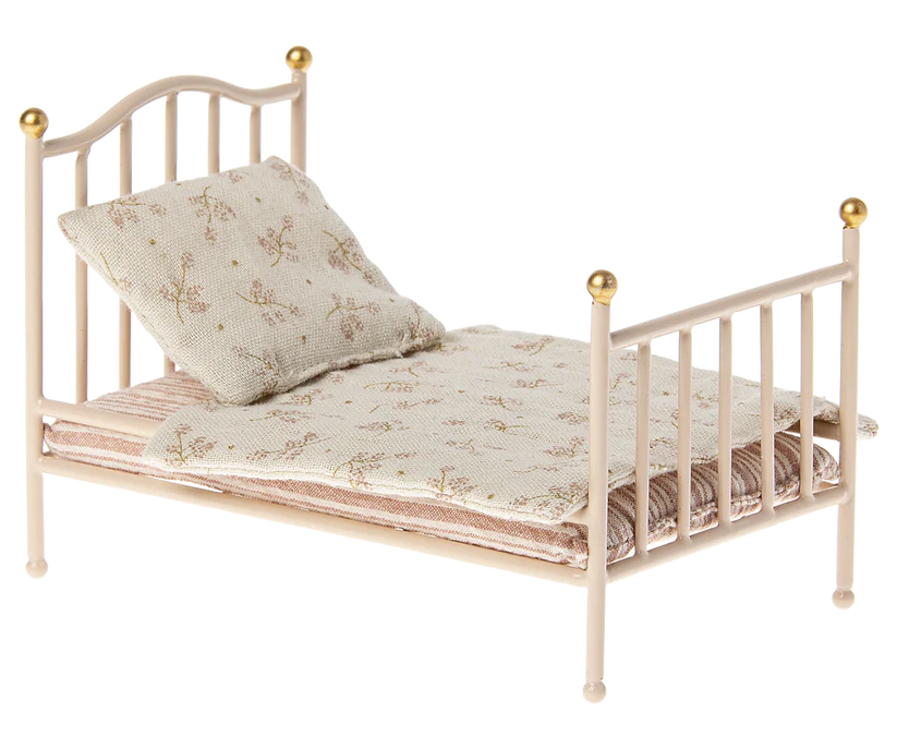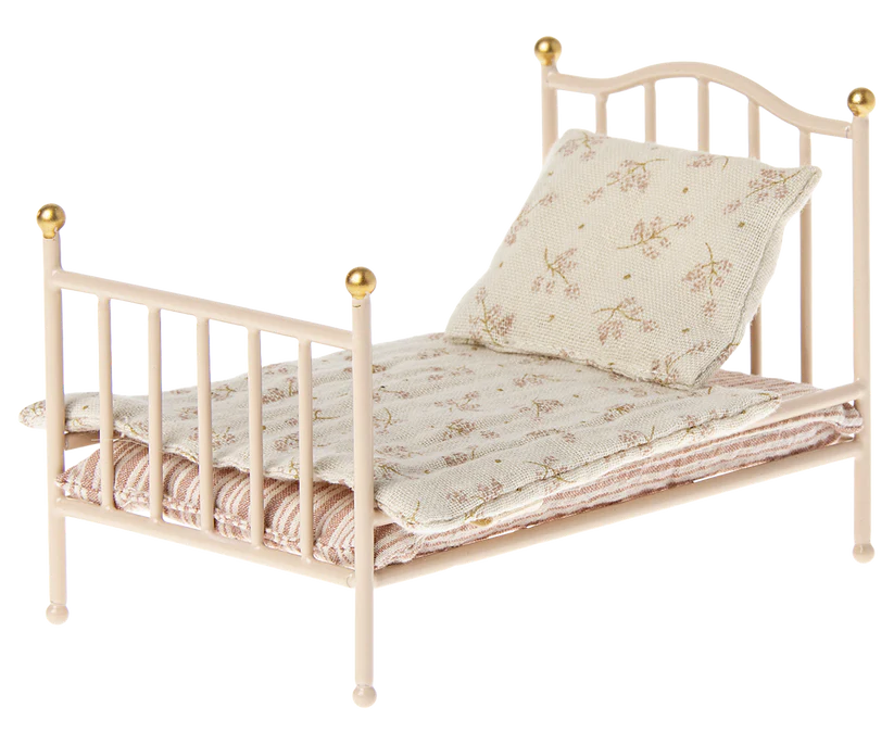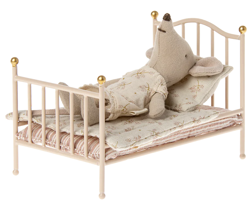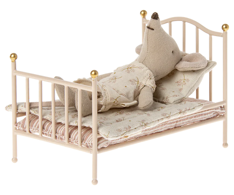 Laissez vos amis Maileg faire une soirée-pyjama dans ce lit vintage en métal. Il est accompagné d'un doux ensemble de linge composé de tissus Maileg. Il convient parfaitement aux souris de petite taille.