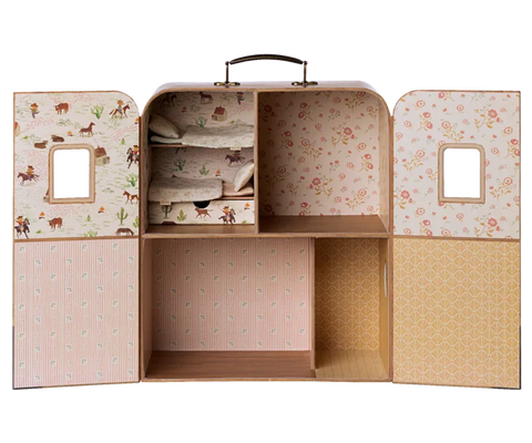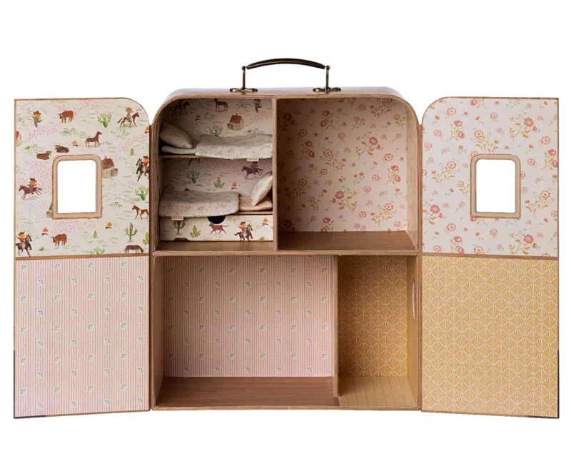 Bienvenue à SuitCasa, une minuscule maison portable. Elle est idéale pour un frère et une sœur souris. Deux ensembles de literie douillette sont inclus pour vos amis, et vous pouvez également acheter divers petits meubles pour décorer la maison.