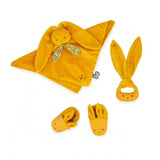 Contient 1 doudou lapin, 1 anneau de dentition en silicone, 1 paire de chaussons lapin
