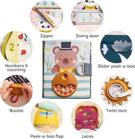 8 pages, avec 10 activités incluses : fermeture velcro, cachette, cachette coulissante, cercle rotatif, fermeture éclair, lacets, nuage coulissant..