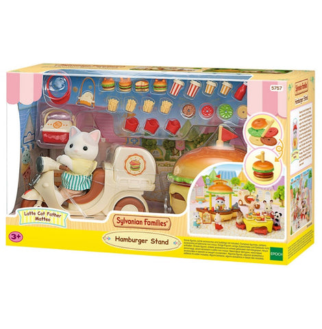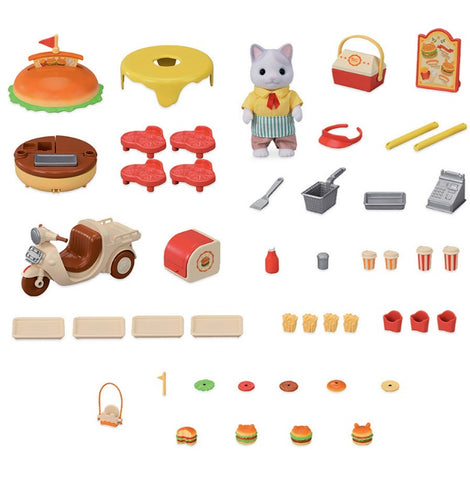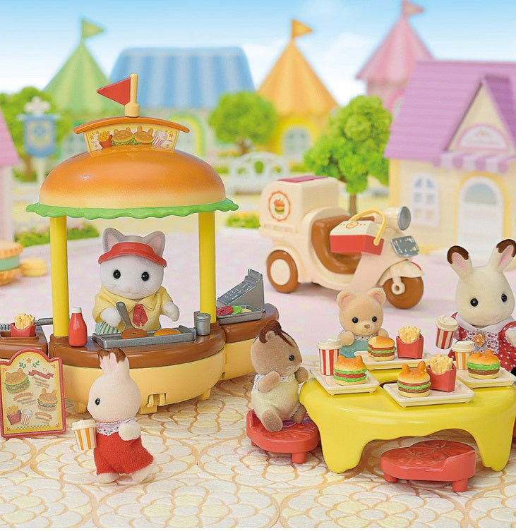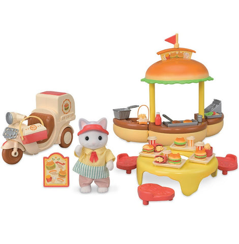 Le stand de hamburgers Sylvanian Families est un adorable set comprenant une figurine chat, un stand de burger aux nombreuses fonctionnalités et tous les accessoires nécessaires pour régaler les gourmands du village. Plus de 35 accessoires pour préparer des burgers, frites et boissons et les livrer dans le village.