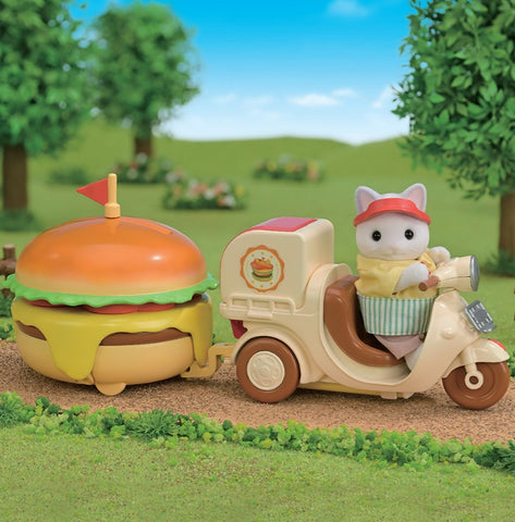Quelle est cette bonne odeur dans les rues du village des Sylvanian Families ? On dirait bien que c'est Matteo le papa Chat Latté qui est en route pour installer son stand de hamburgers sur la place.